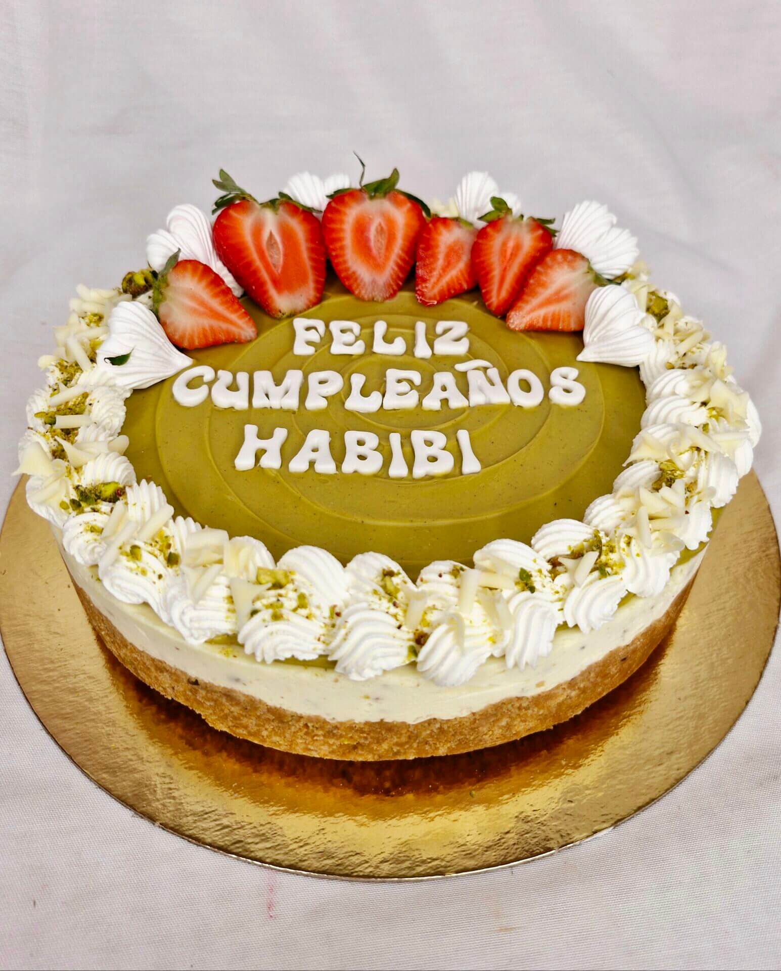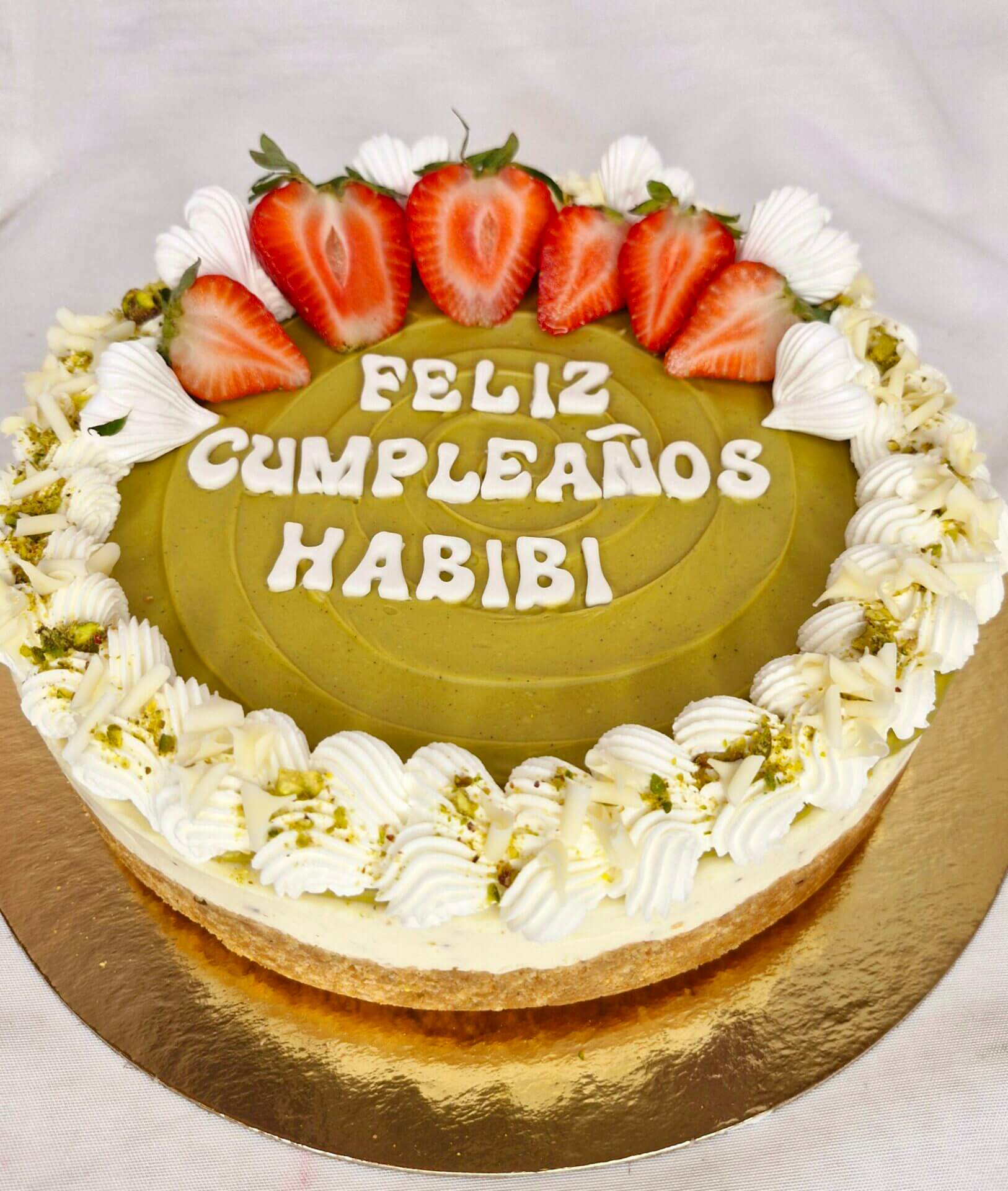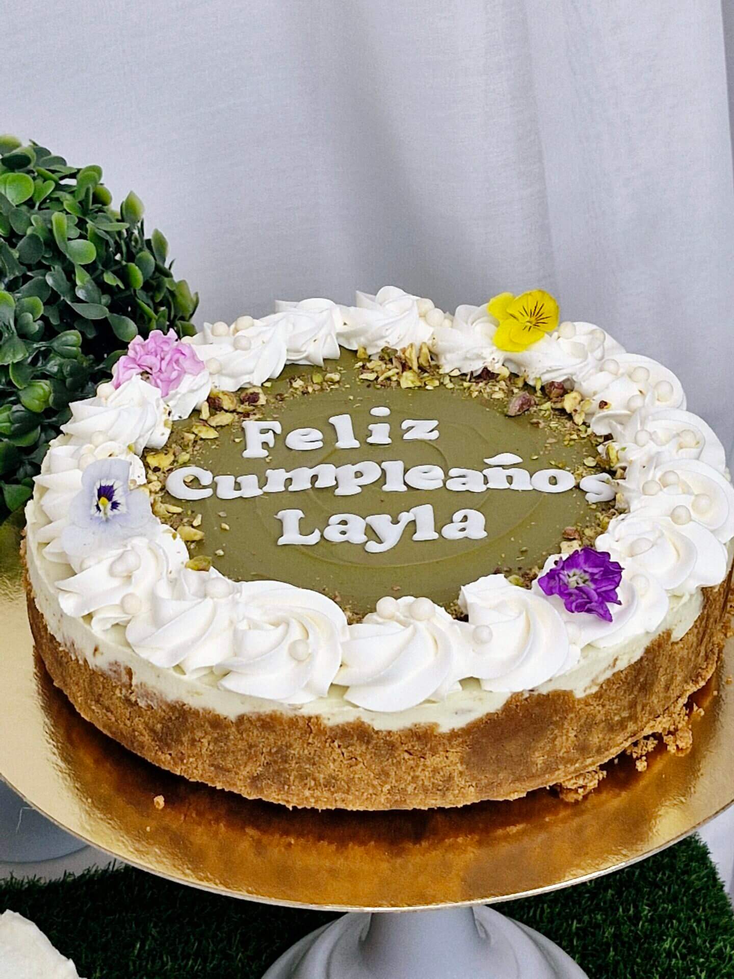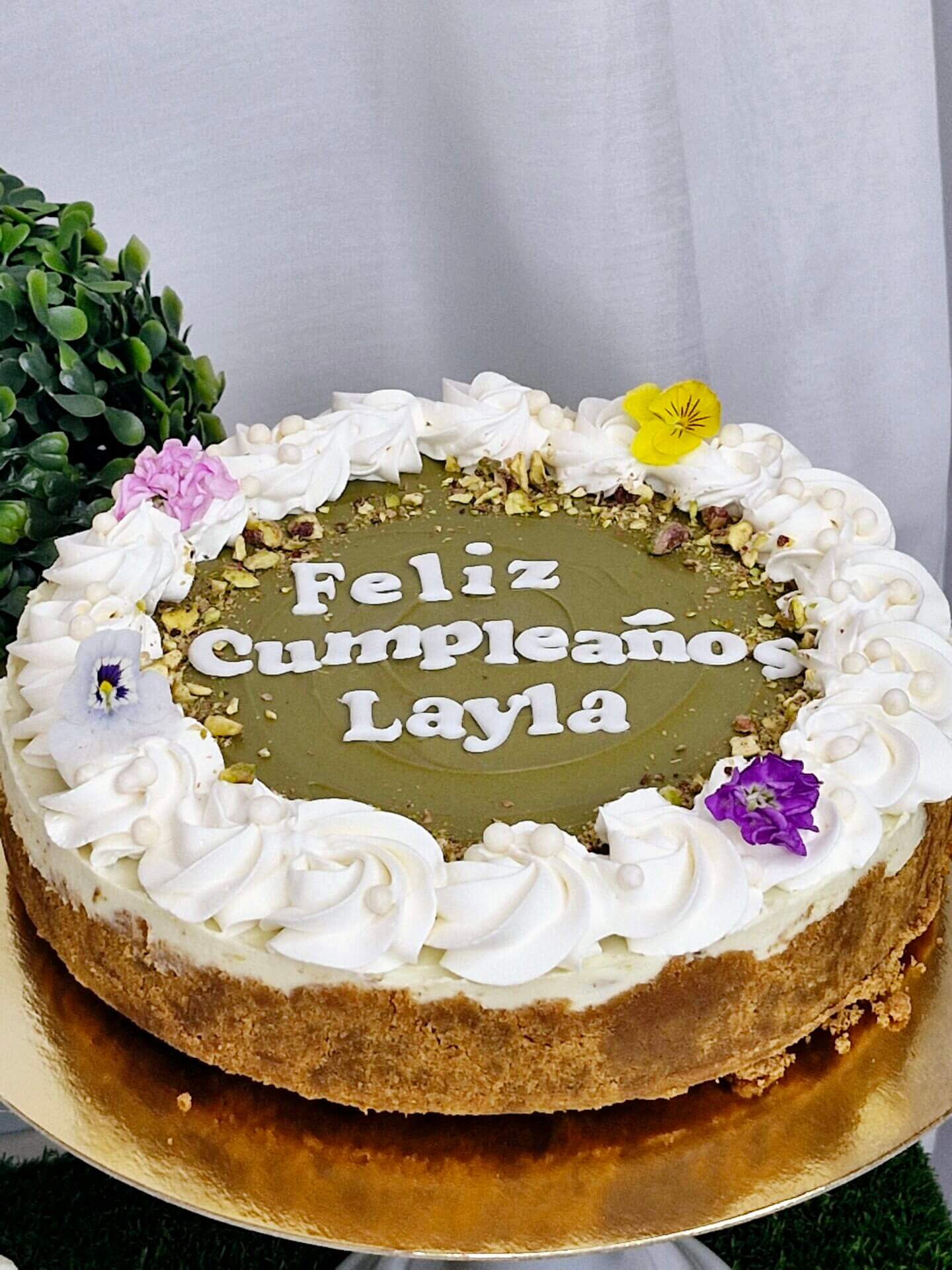 Tarta fría de chocolate blanco y pistacho. Con base de galleta.