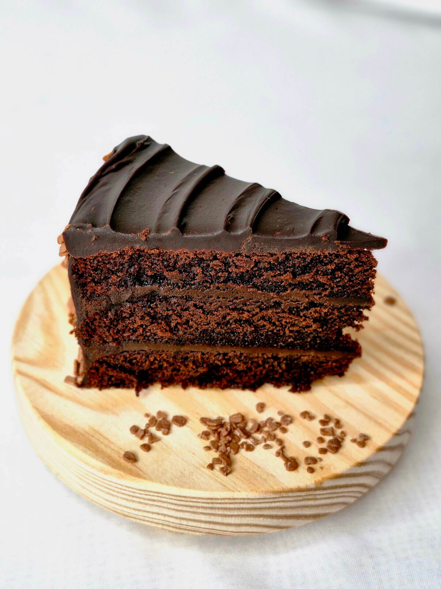 Capas de bizcocho de cacao húmedo con crema especial de cacao y chocolate al 56%.