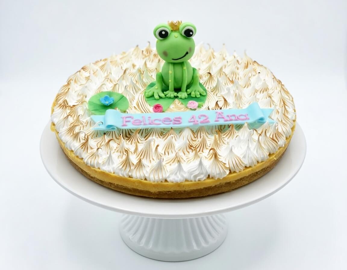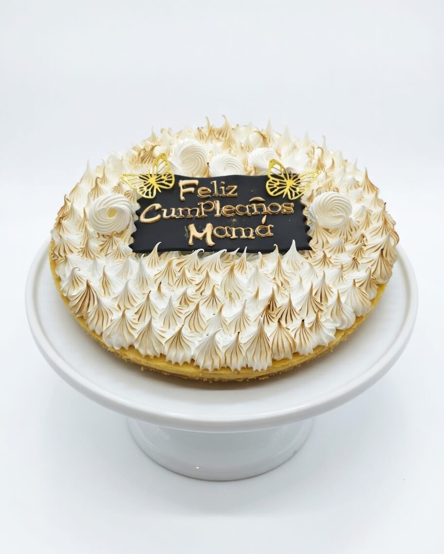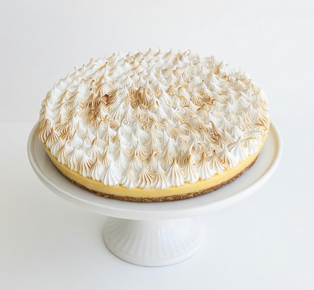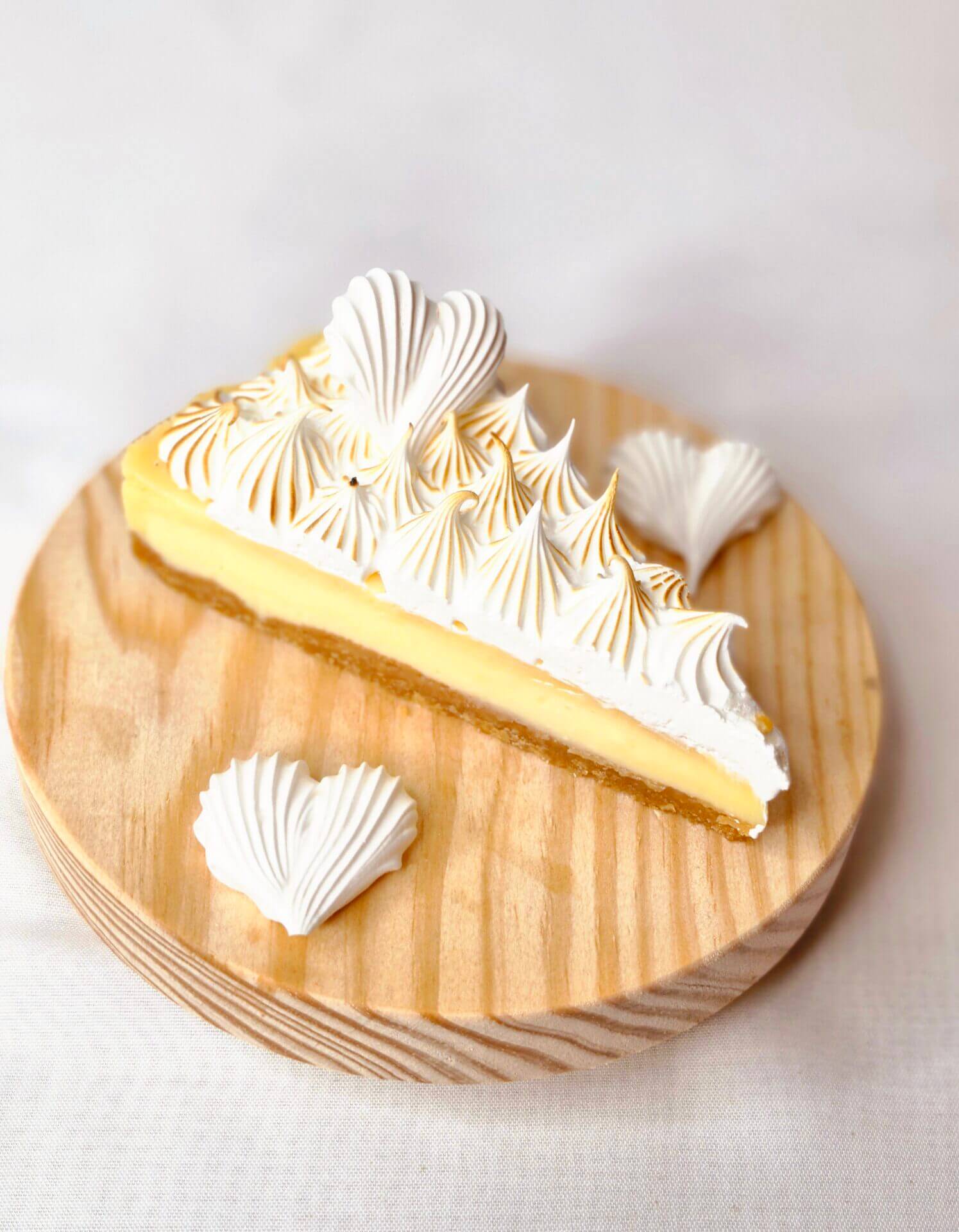 Crujiente base de galletas, suave crema de limón y merengue tostado.  Decorado con suspiros y ralladura de limón